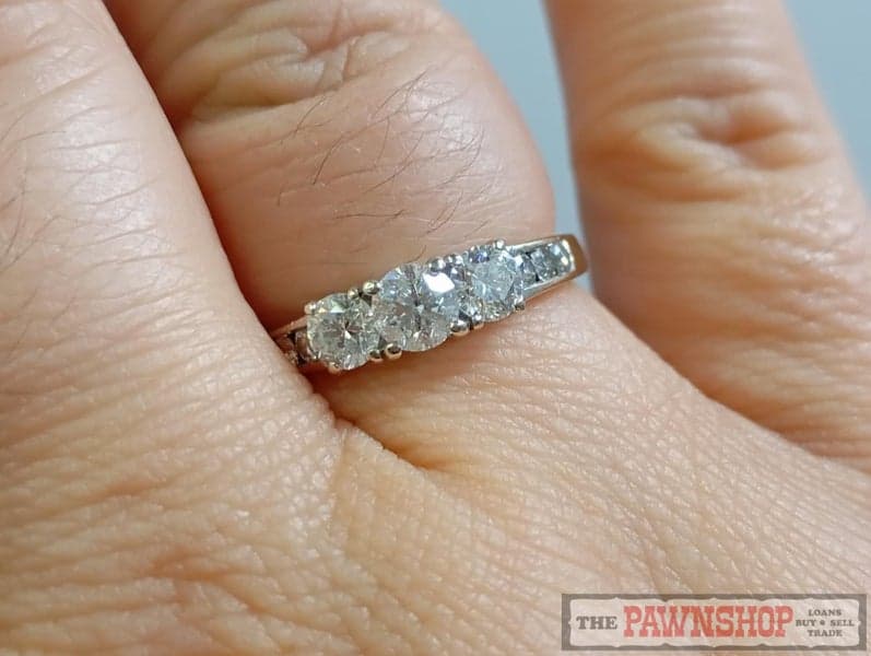 On offer here is a 14ct White Gold 3 Stone Diamond Ring with Shoulder Diamonds