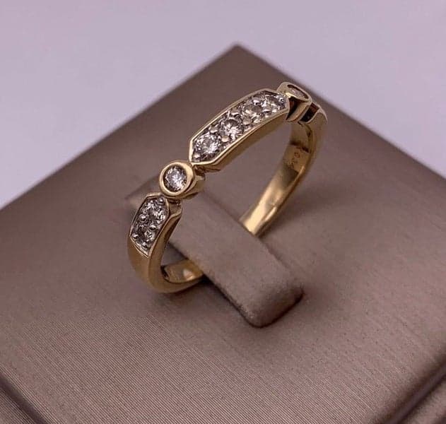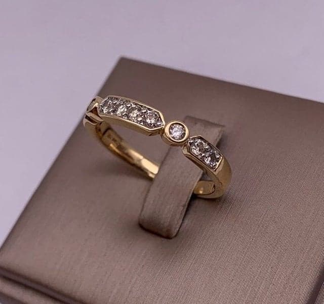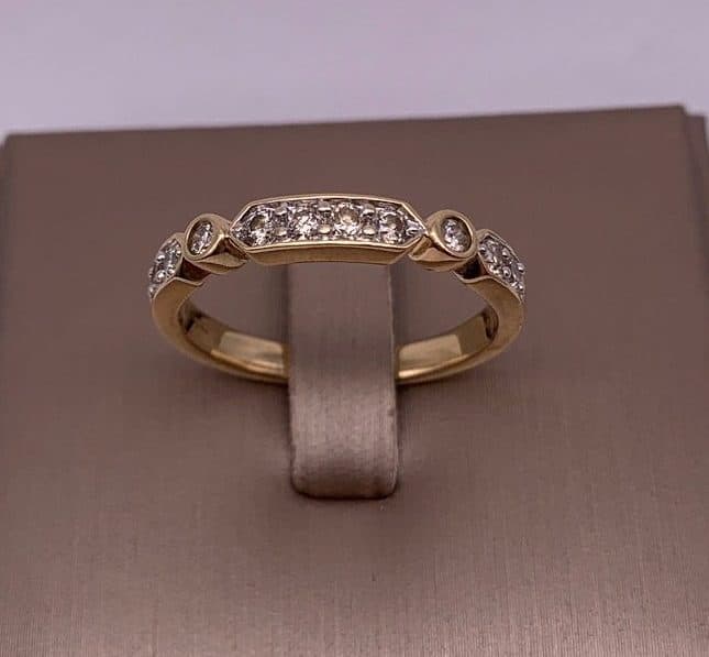 This ring features 10x round brilliant diamonds set in an 14ct yellow gold setting.