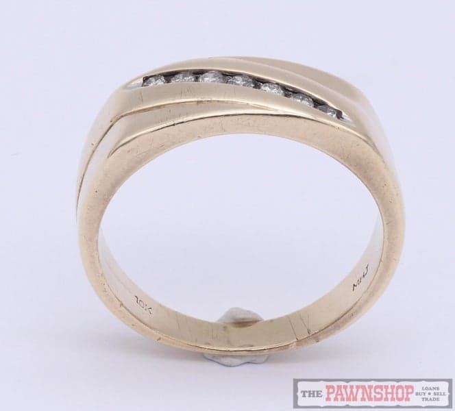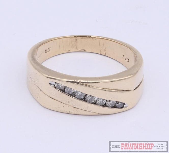 On offer here we have this 10ct Yellow Gold Men's Diamond Dress Ring, a semi-round square edge band with a diagonal row of 7 channel set diamonds.