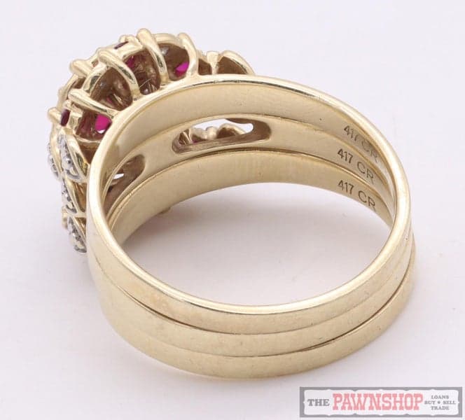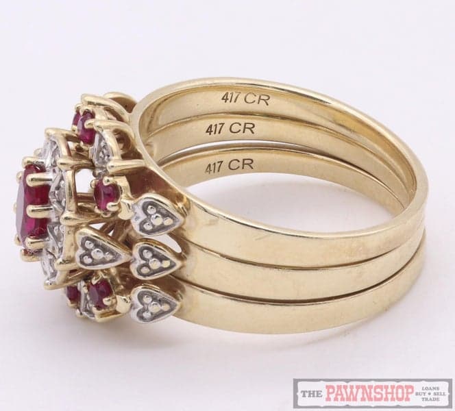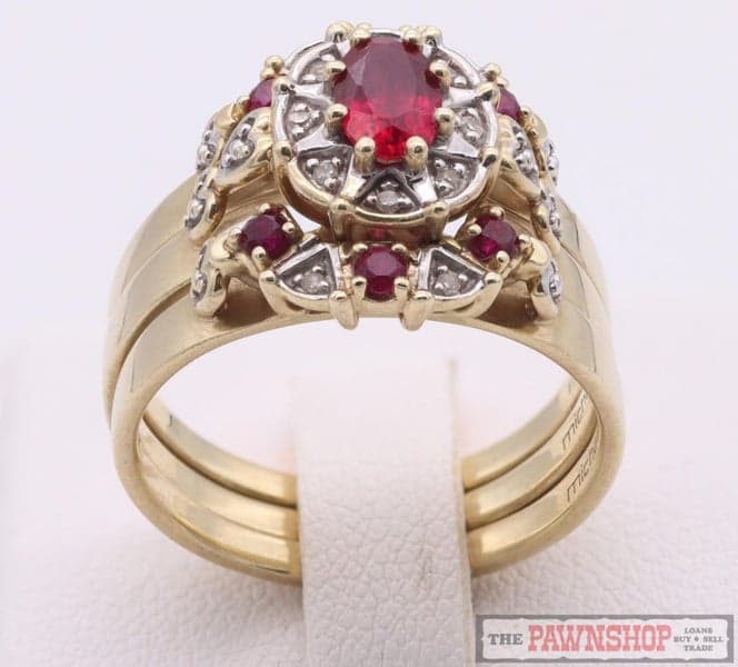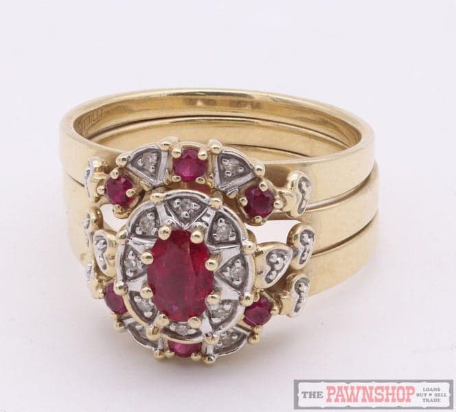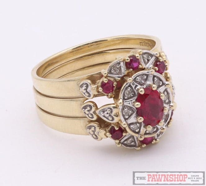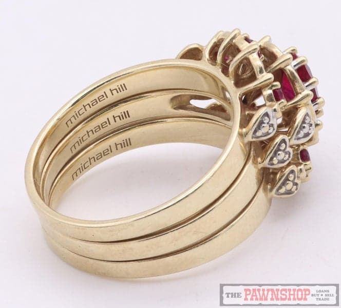 On offer here we have this elegant 10ct yellow gold Michael Hill created ruby and diamond three ring set.