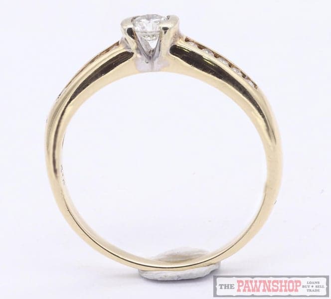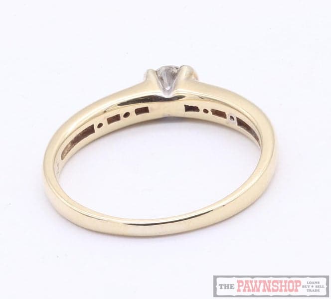 On offer here we have this 10ct Yellow Gold Modern Diamond Solitaire ring, on a hollow backed tapered band, with a round brilliant cut diamond set in a white gold V shaped coronet, with 5x small round brilliants channel set on each shoulder.