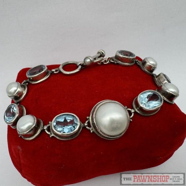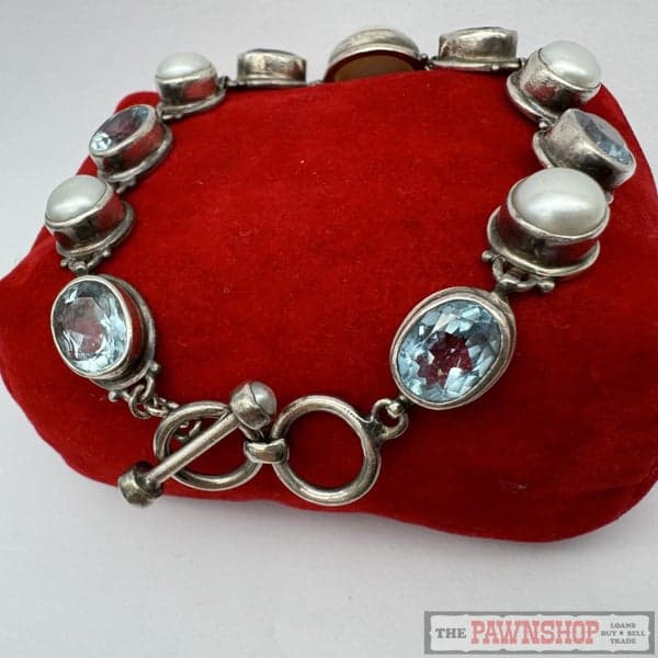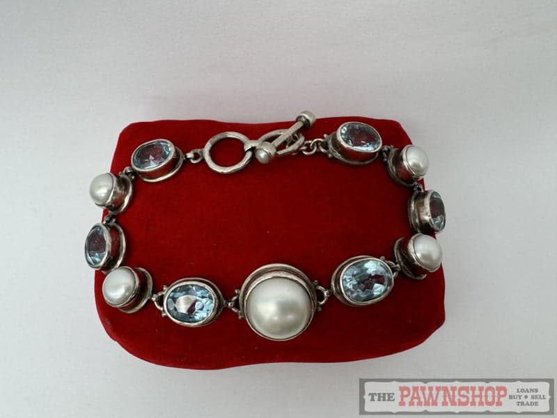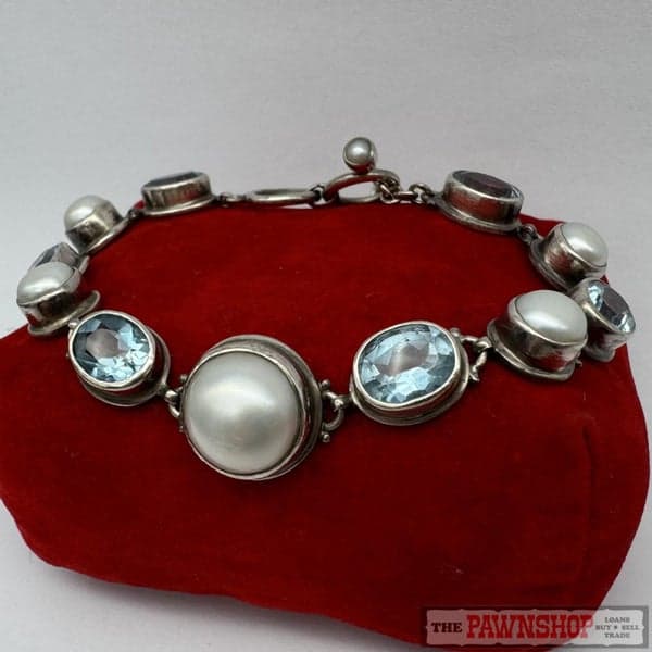 On offer here is a 13.80ct TDW Aquamarine & Mabe Pearl Sterling Silver Bracelet
