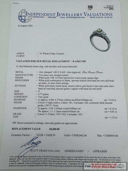 Colour: F, Clarity: Vs1-Vs2, Cut: Good+