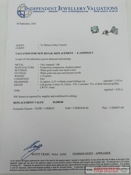 On offer here is a pair of 14ct White Gold 2.05ct TDW Laboratory-Grown Diamond Round Brilliant Cut Stud Earrings.