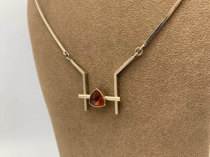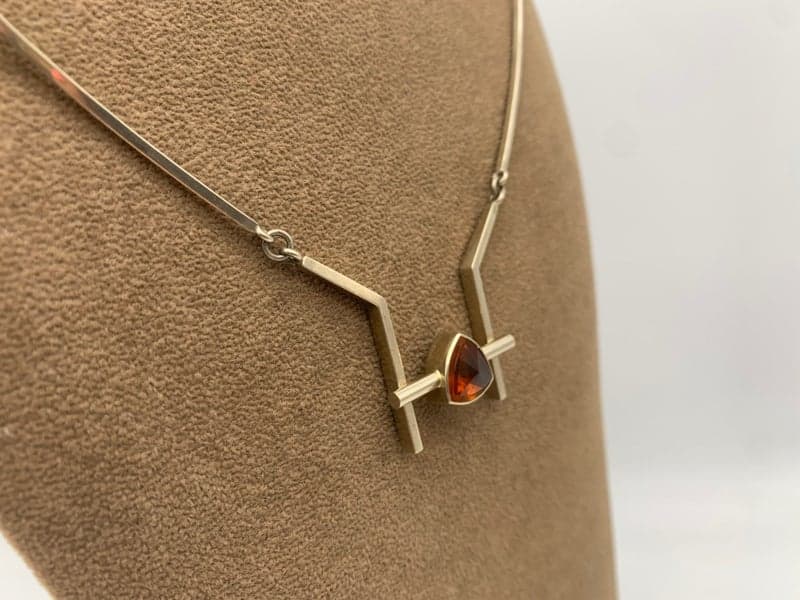 This 14ct white gold necklace features a collect rubover central citrine with a bar front, angled supports and curved sections.
