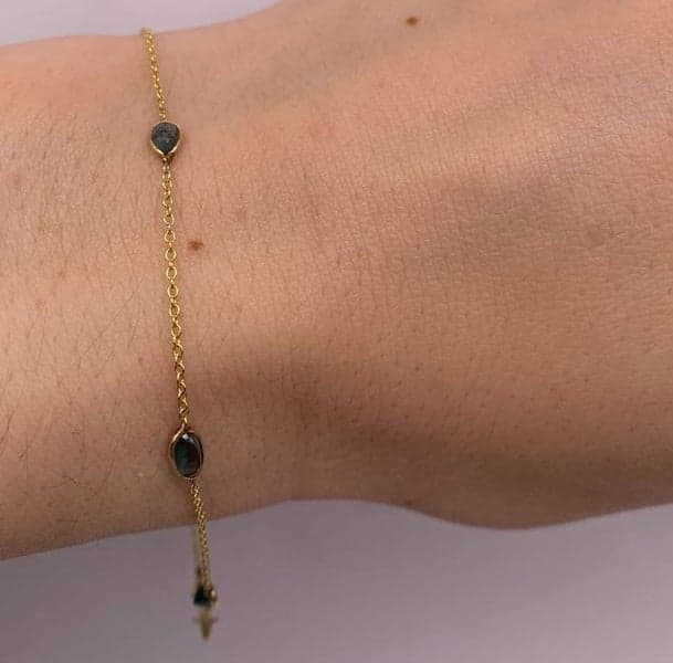 6x pear and oval mixed cut sapphires set in a rubover setting with alternating cable link sections, small bolt clasp.