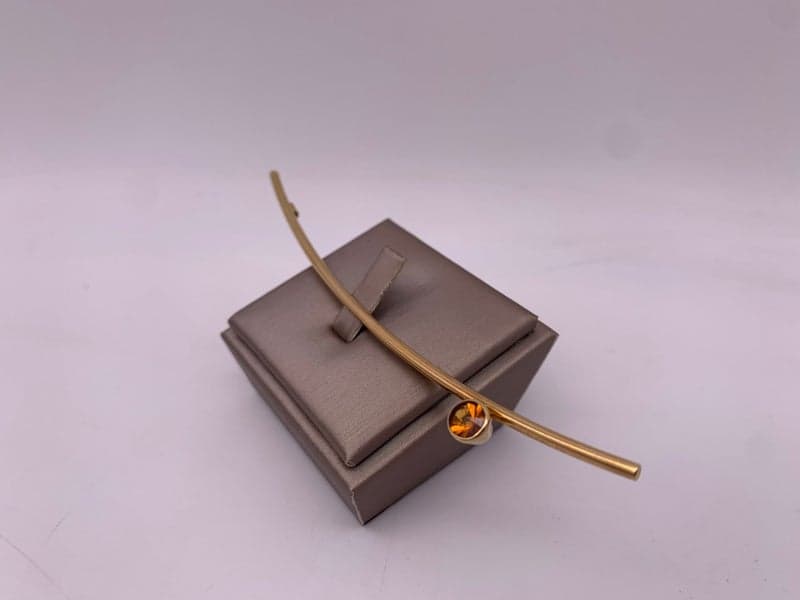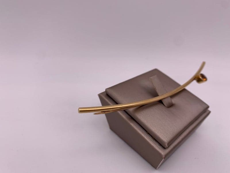 This 14ct yellow gold brooch features a curved bar with a collect rubover off-centre citrine.