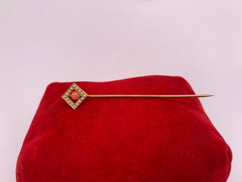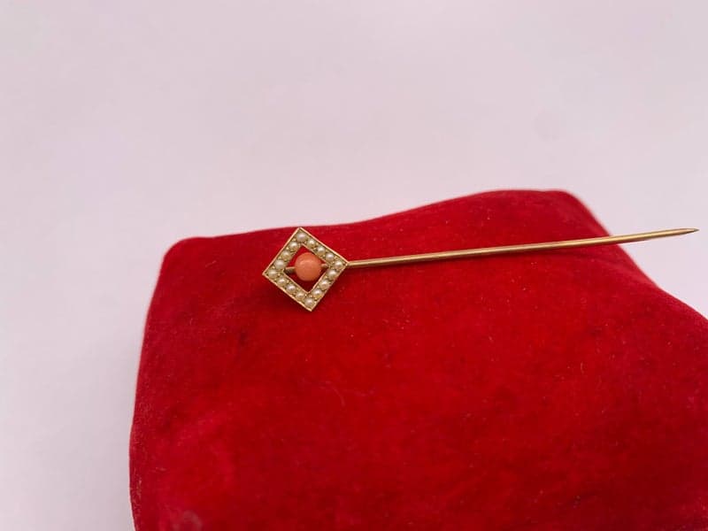 On offer here is a 14ct Yellow Gold Coral & Seed Pearl Pin