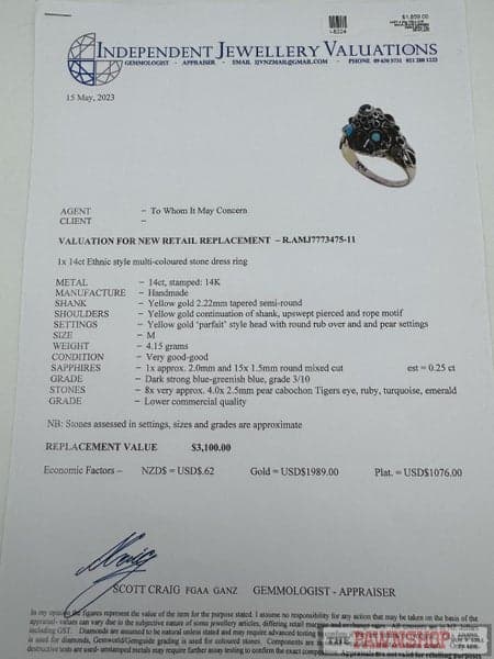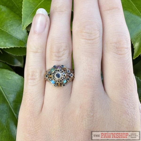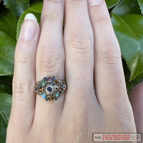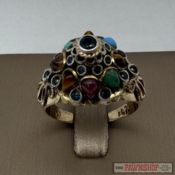On offer here is a 14ct Yellow Gold Sapphire, Tigers Eye, Ruby Turquoise & Emerald Ring
