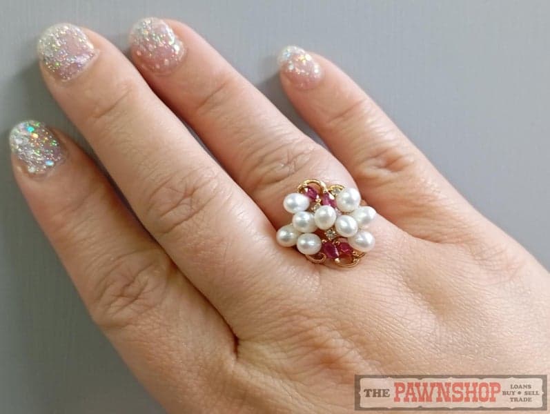 14CT YG Freshwater Cultured Pearl Ruby and Diamond Dress Ring $3,000