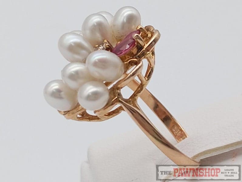 On offer here is a 14ct Yellow Gold Freshwater Cultured Pearl Ruby and Diamond Dress Ring