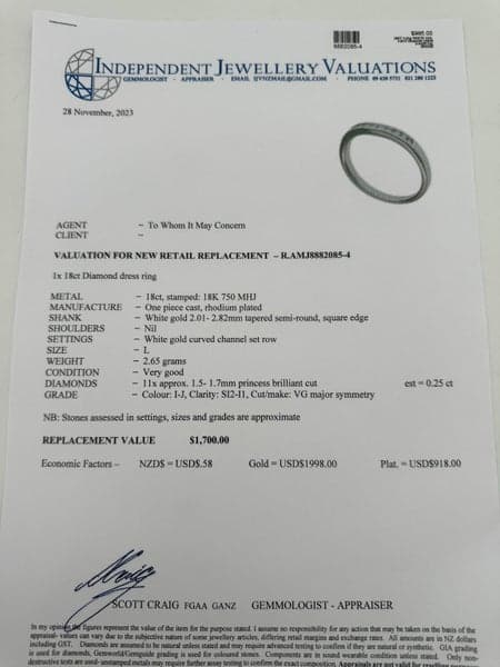 Replacement Value: $1,700 NZD