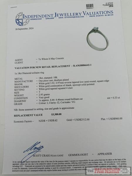 18ct White Gold 0.33ct TDW Diamond Solitaire Ring ~ $3,300!