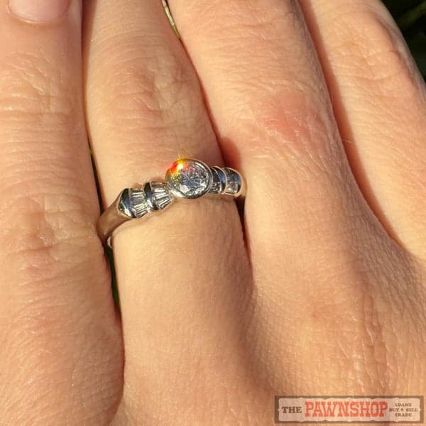 On offer here is a 18ct White Gold Diamond Solitaire Ring with Baguette Shoulder Diamonds.