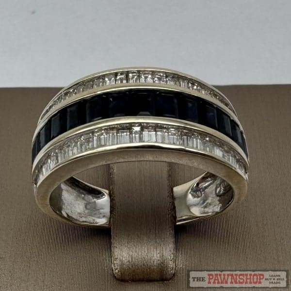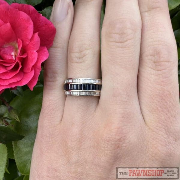 On offer here is a 18ct White Gold Sapphire & Diamond Baguette Dress Ring