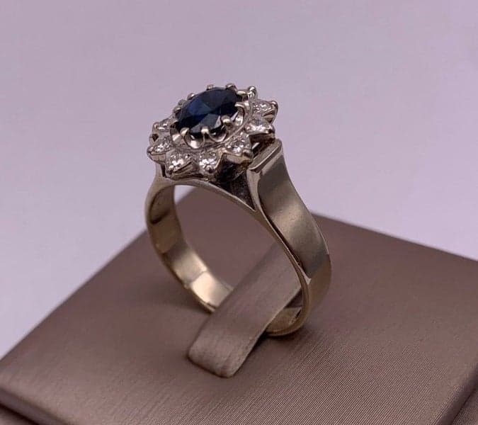 This ring features a central blue sapphire with 10x surrounding diamonds set in an 18ct white oval cluster setting.