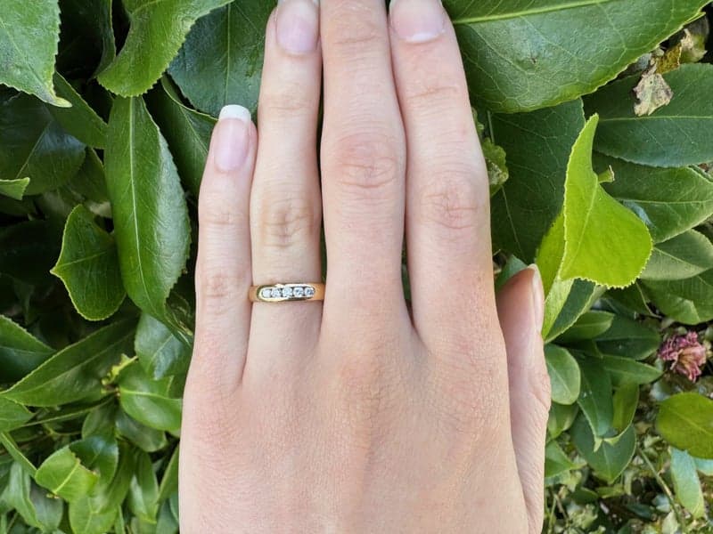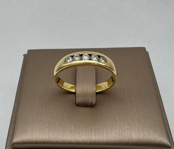 This ring features 5x round brilliant diamonds set in an 18ct yellow gold setting.