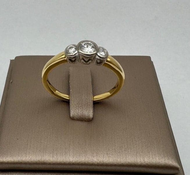 On offer here is an 18ct Yellow Gold Three Stone Diamond Rub-over Ring