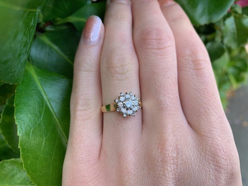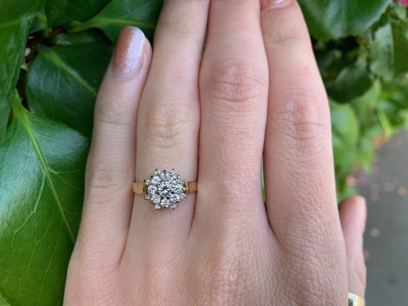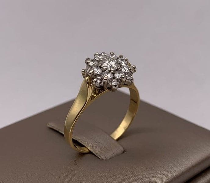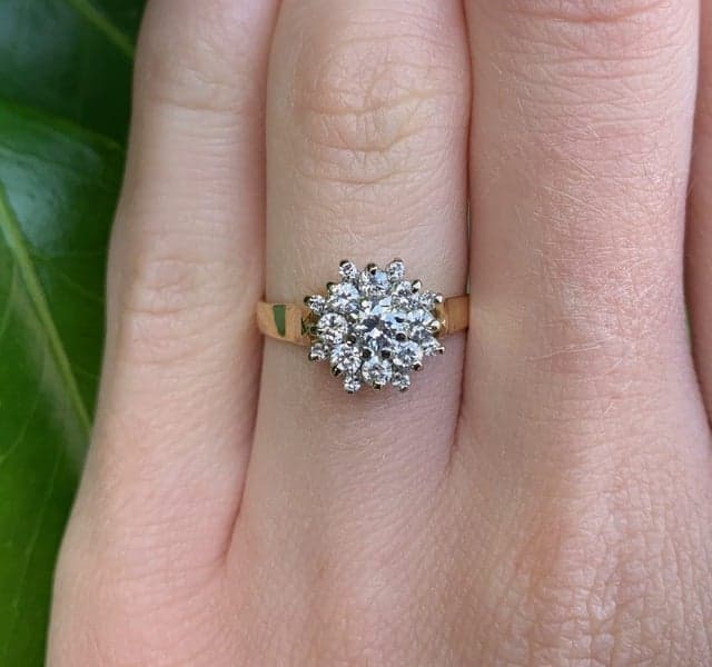 This ring features 9x round brilliant diamonds set in a cluster head 18ct Yellow gold setting.