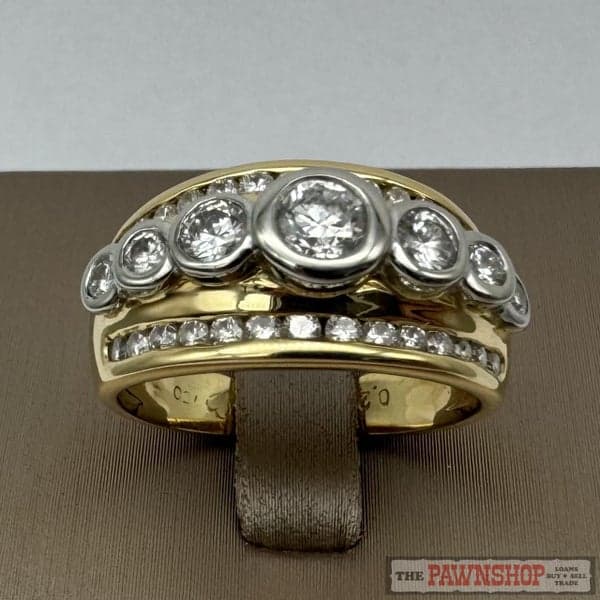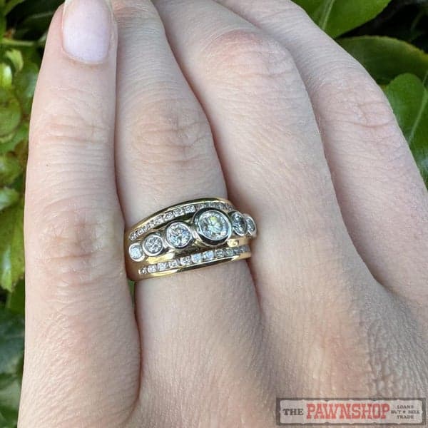 This ring features 1x row of graduated rub over set diamonds with 2x rows of channel set diamonds.
