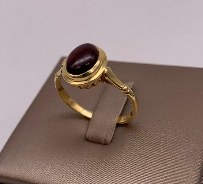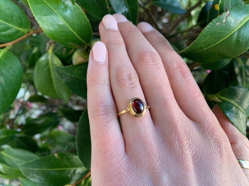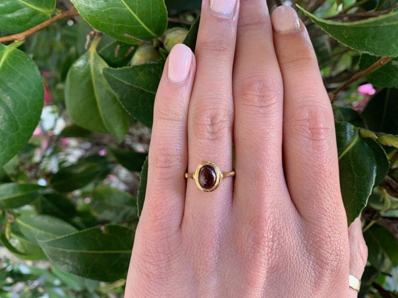 This ring features 1x oval cabochon garnet set in a 18ct yellow gold oval rub over setting.