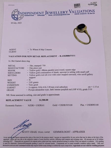 Replacement Value: $1,900 NZD