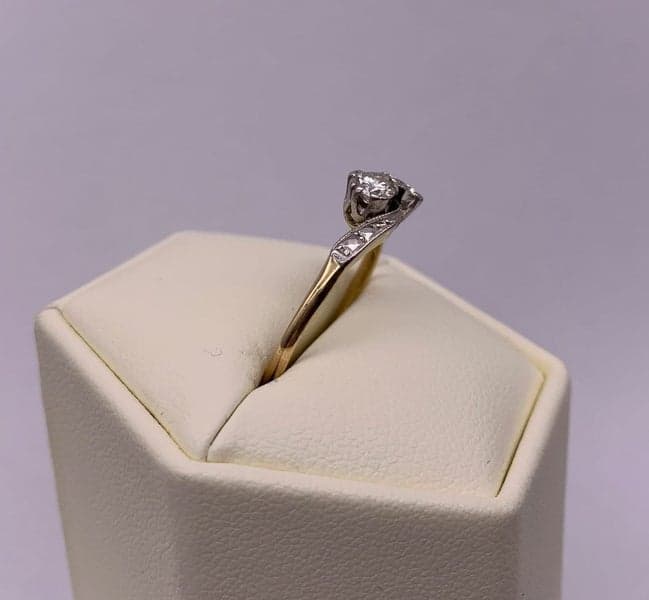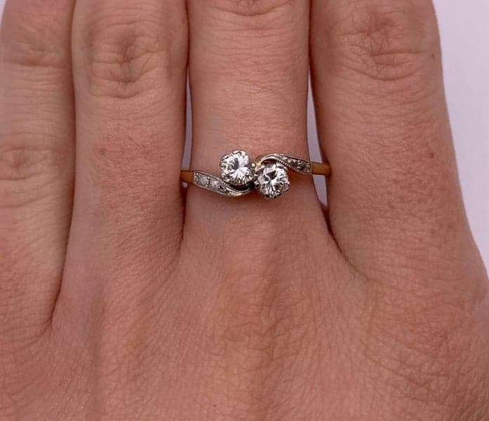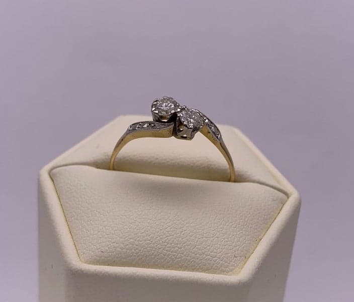 This very beautiful ring features 2x round brilliant cut diamonds which are set in 18ct white gold claws. The diamonds are set in an upswept crossover style in an 18ct yellow gold setting.