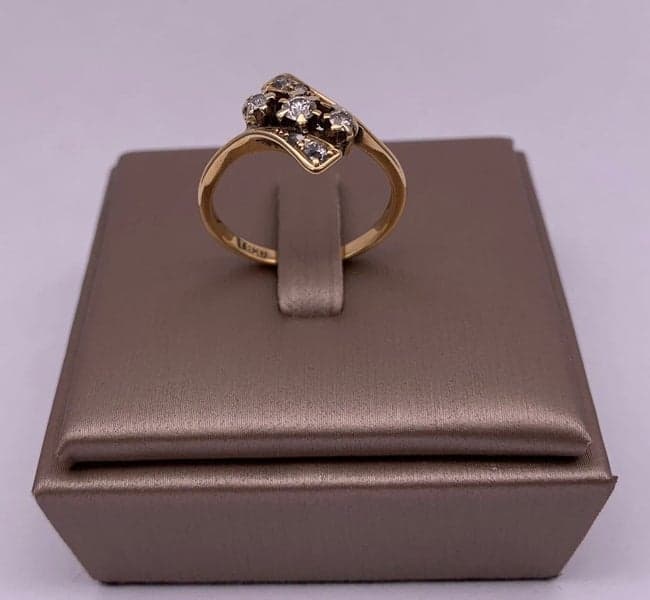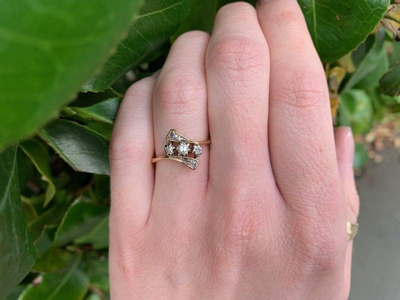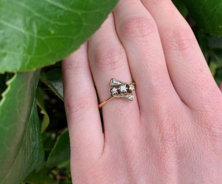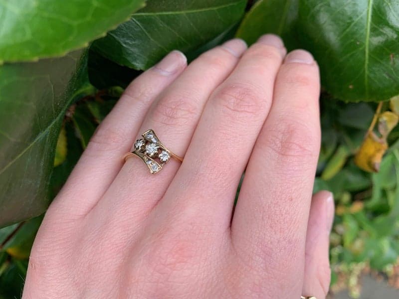 This very beautiful ring features 3x early round brilliant cut diamonds which are set in 18ct white gold claws. The setting is shaped on a diagonal with diamonds set in the scrolls either side.