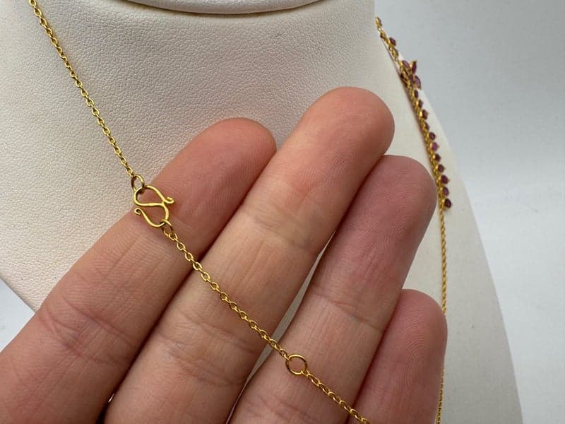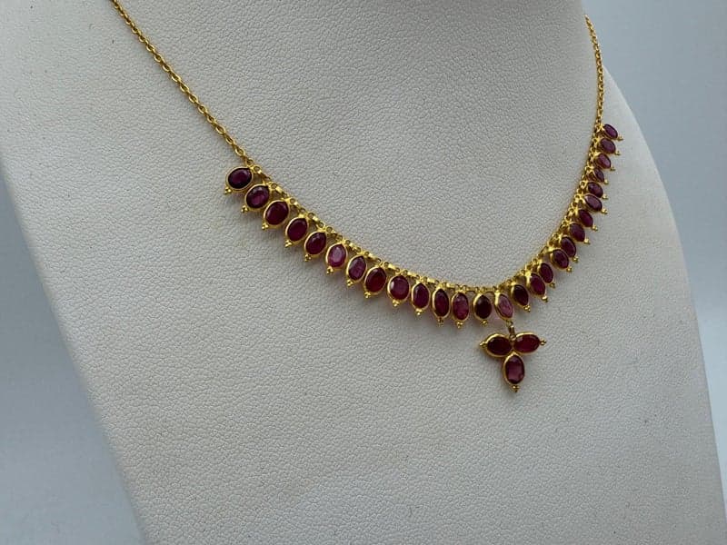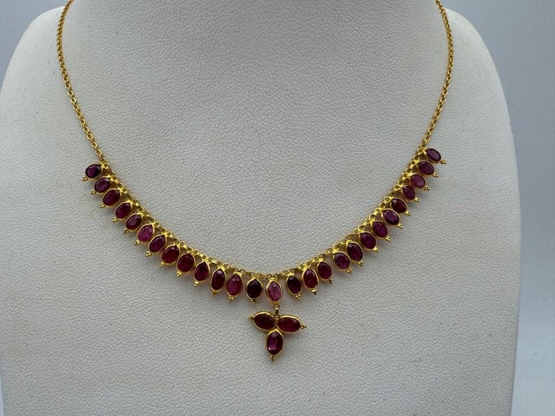 This necklace features a fine cable link with 30x oval mixed cut rubies with a central cross-shaped drop. Small yellow gold "S" clasp.