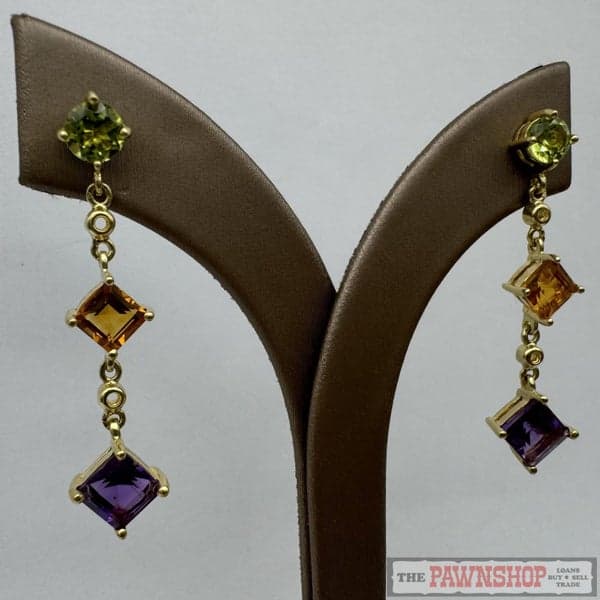 On offer here is a pair of 18ct Yellow Gold Amethyst, Peridot & Citrine Drop Stud Earrings