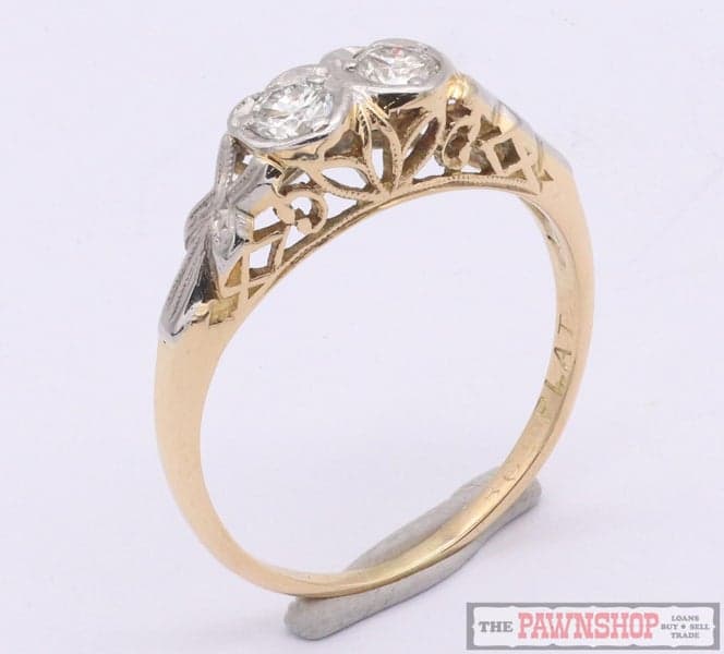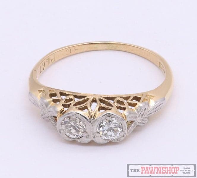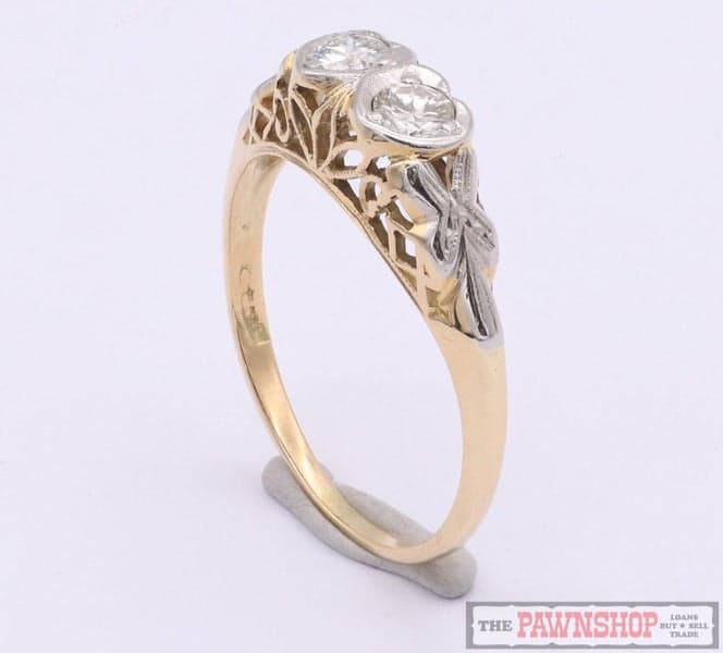 On offer here we have this handmade 18ct yellow gold and platinum two stone diamond ring, featuring an 18ct yellow gold 1.34mm band and two diamonds set in a platinum "double heart" setting.