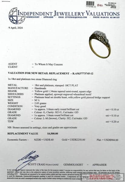 Colour: G, Clarity: SI2-I1, Cut/make: GD