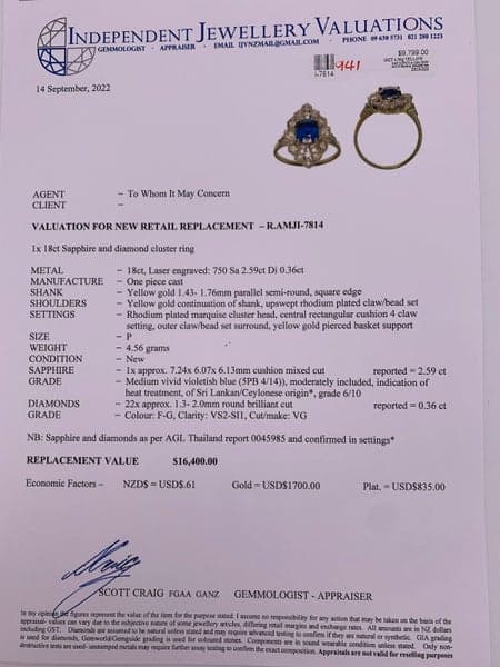 Replacement Value: $16,400 NZD