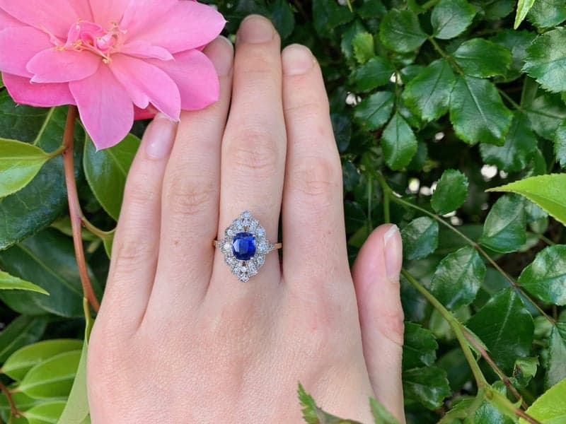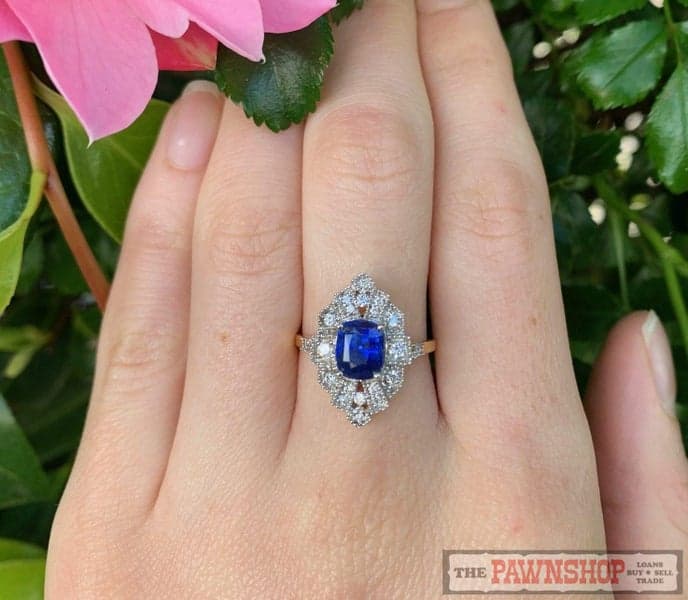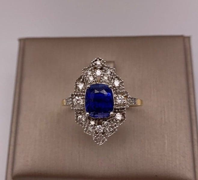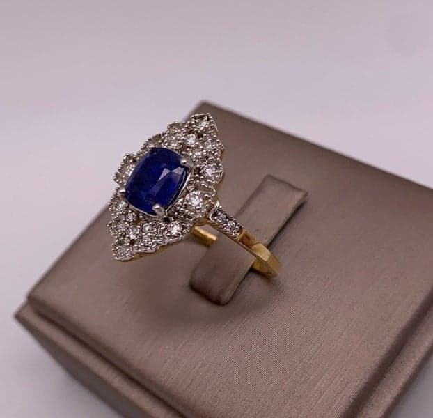 This ring features 1x cushion mixed cut sapphire with 22x round brilliant diamonds set in an 18ct yellow gold marquise shaped setting.