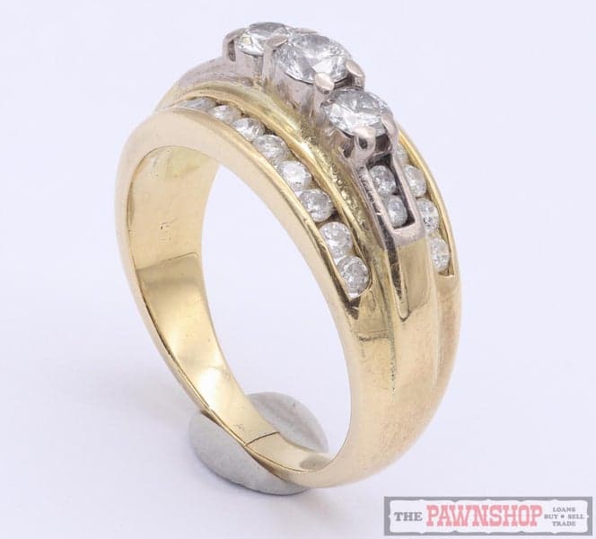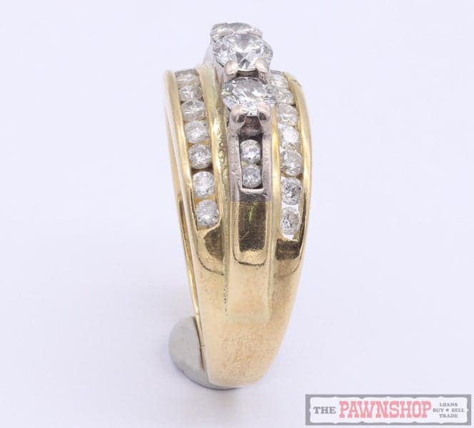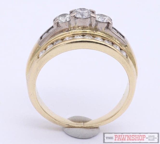 On offer here we have this stunning 18ct yellow gold dress ring featuring 1.00cts of diamonds in a white gold 4-claw setting and channel set shoulders on a tapered semi-round square edge band.