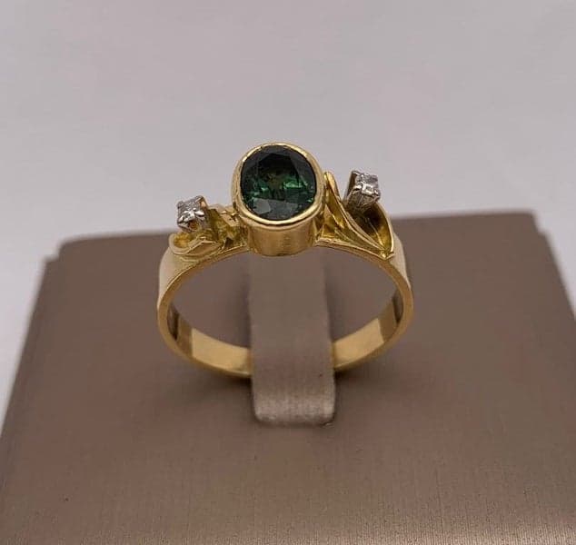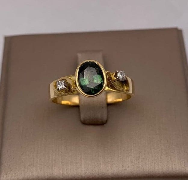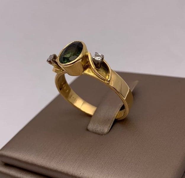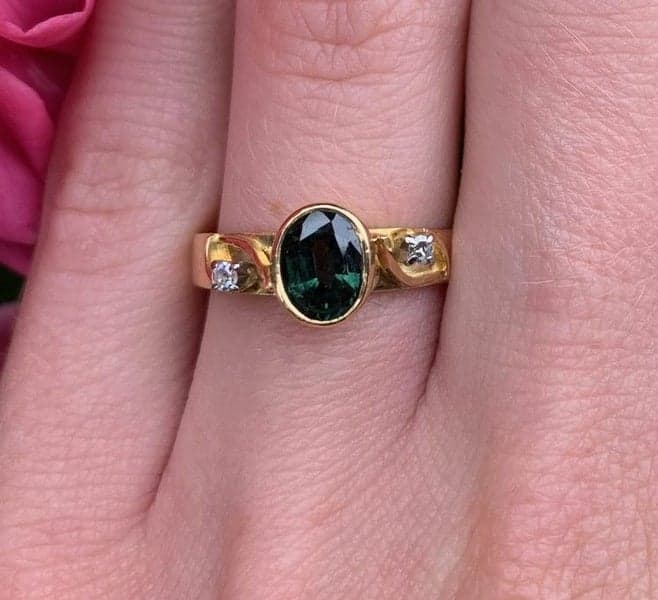 This ring features 1x green sapphire with 2x accent diamonds set in an 18ct yellow gold rub over setting.