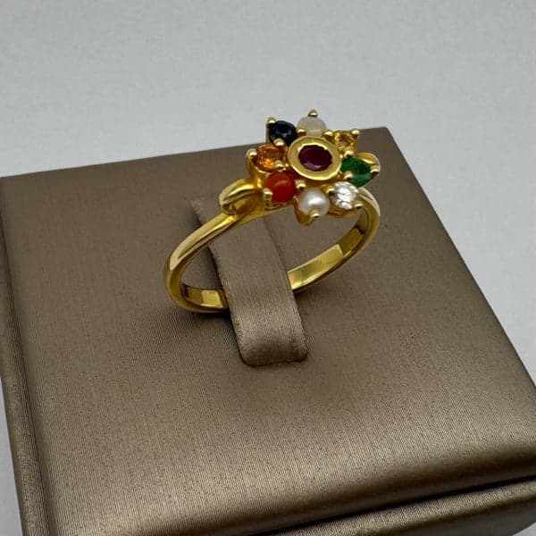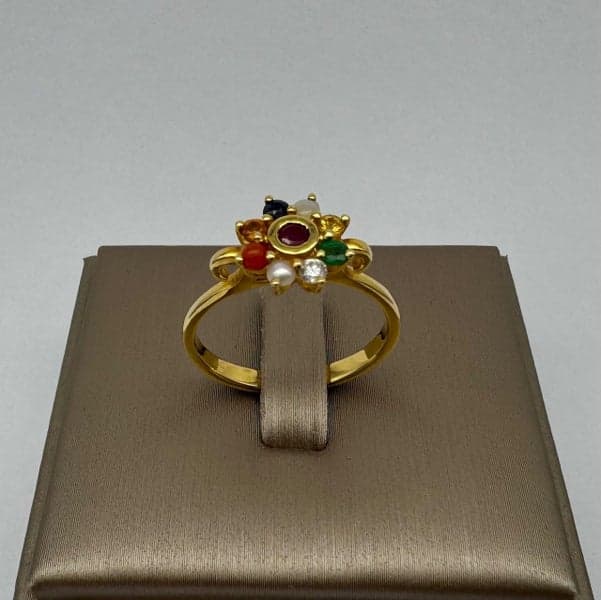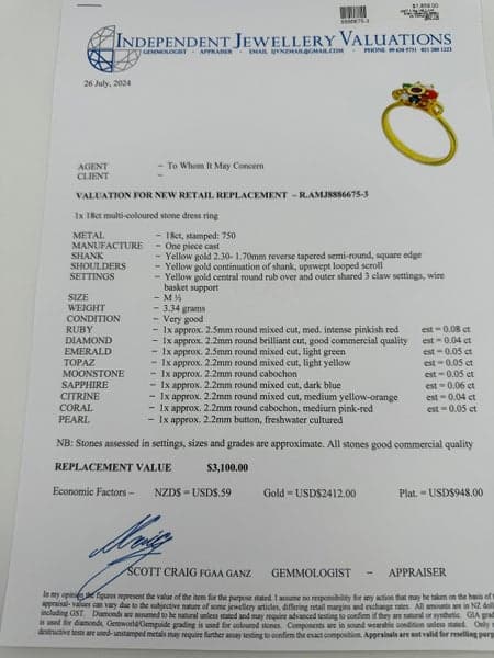 On offer here is a 18ct Yellow Gold Ruby, Emerald, Topaz, Moonstone, Sapphire, Citrine, Coral, Pearl & Diamond Dress Ring.
