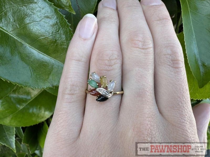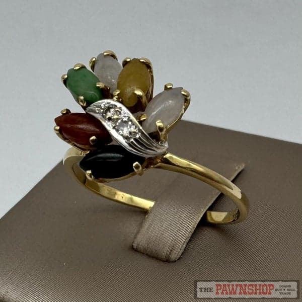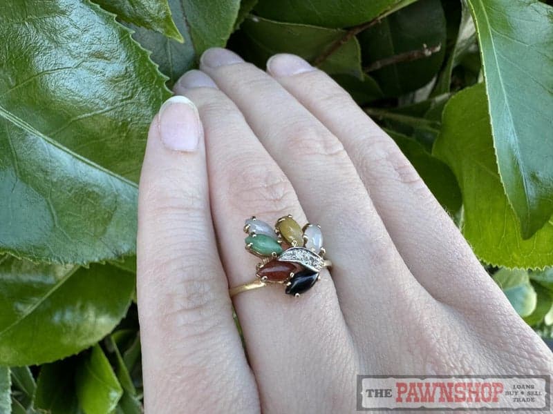 On offer here is a 18ct Yellow Gold Black, Brown, Yellow, White Jade & Diamond Dress Ring.