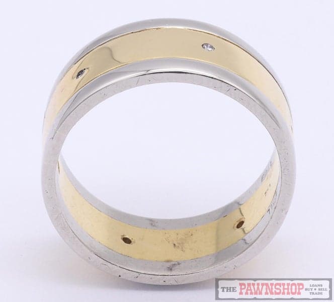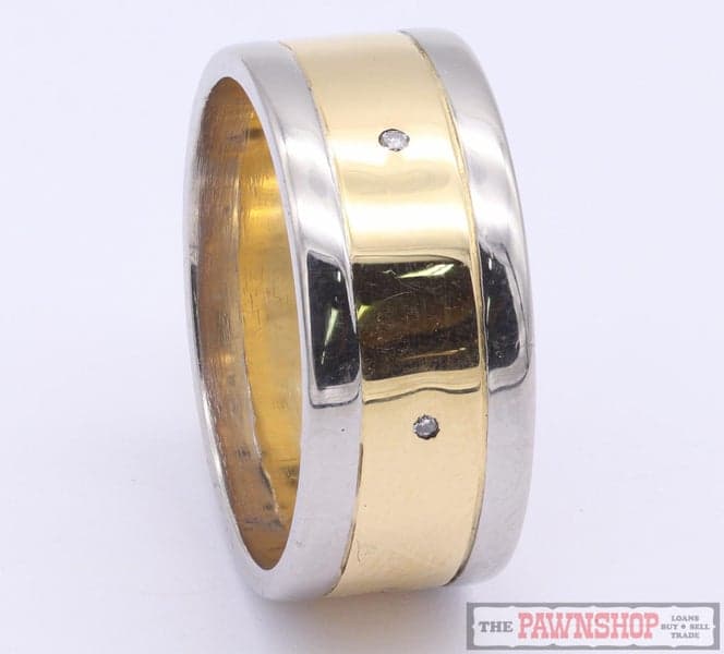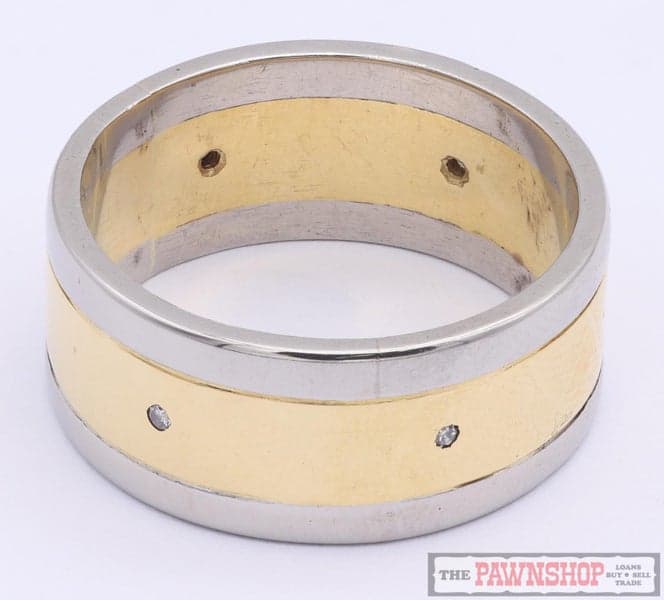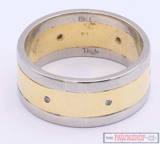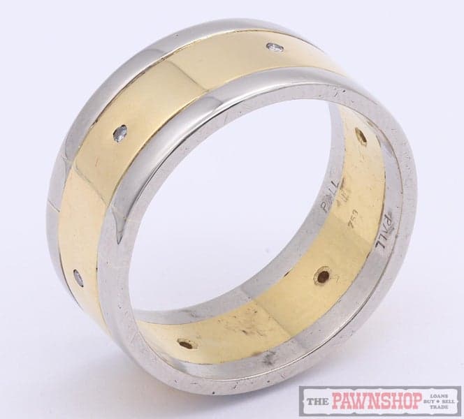 On offer here we have this heavy 18ct yellow gold and palladium 6 stone diamond ring featuring a thick yellow gold and palladium parallel flat square edge band, and 0.06cts of round brilliant cut diamonds.