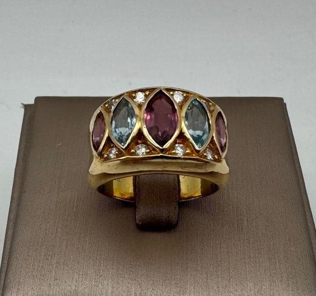 On offer here is a 18ct Yellow Gold Blue & Pink Topaz Diamond Dress Ring.