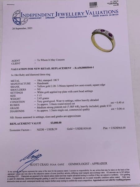 Replacement Value: $3,000 NZD
