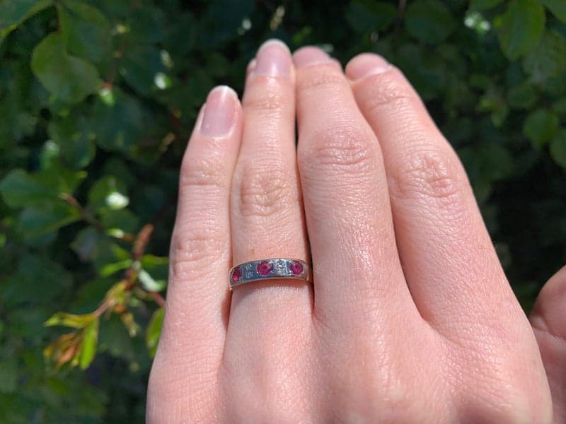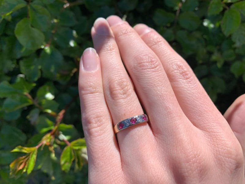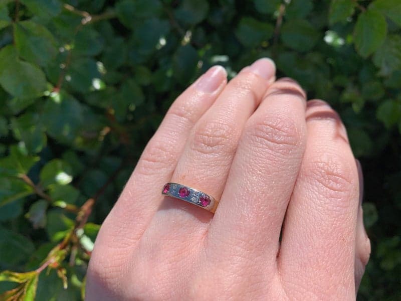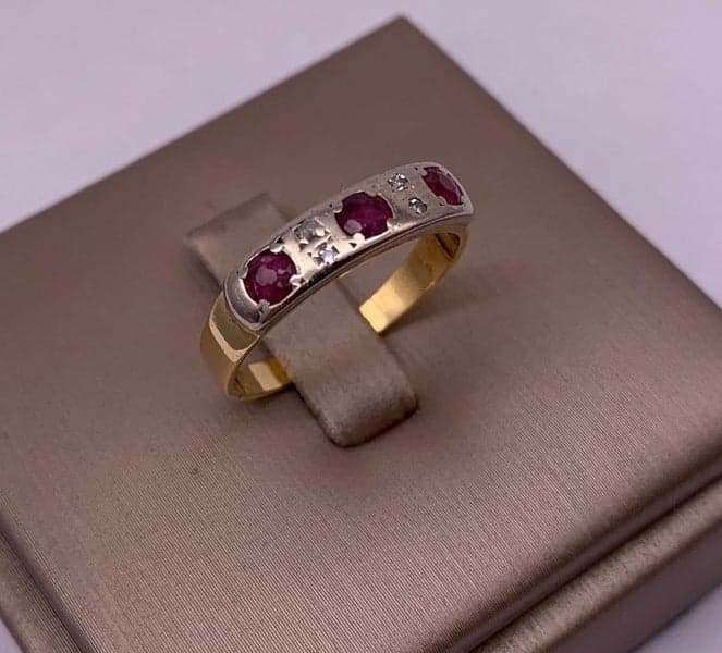 This ring features 3x round mixed cut rubies, 4x single cut diamonds set in a 18ct yellow gold setting.