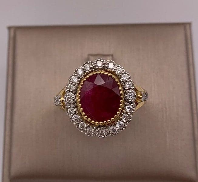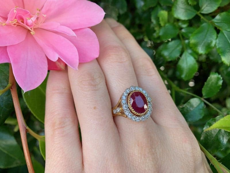This ring features 1x oval mixed cut ruby with 20x round brilliant diamonds set in an 18ct yellow gold oval shaped setting.