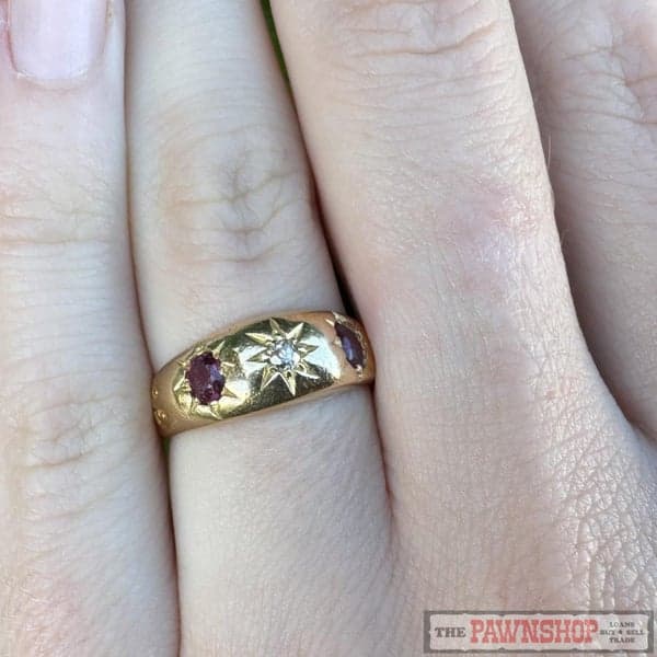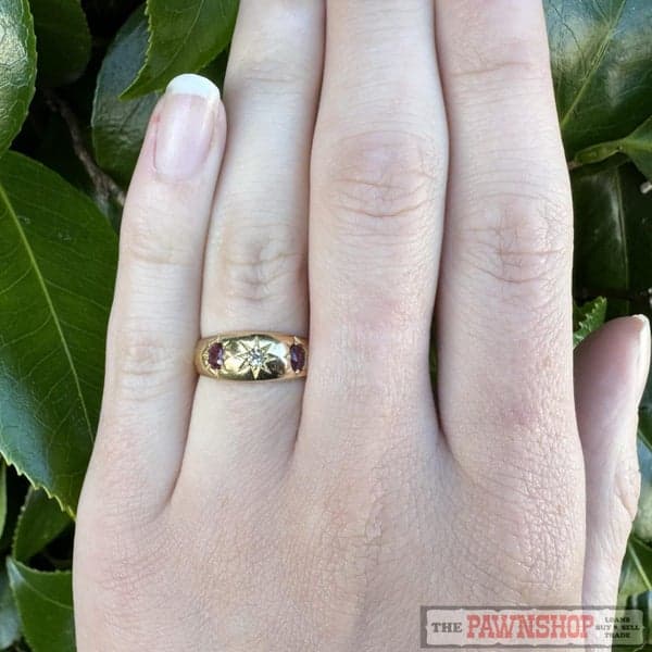 On offer here is a 18ct Yellow Gold Natural Ruby & Diamond Gypsy Ring