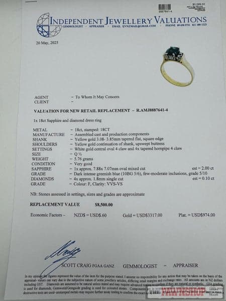 Replacement Value: $8,500 NZD