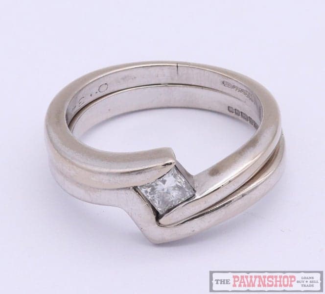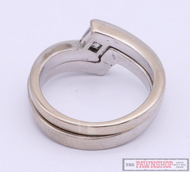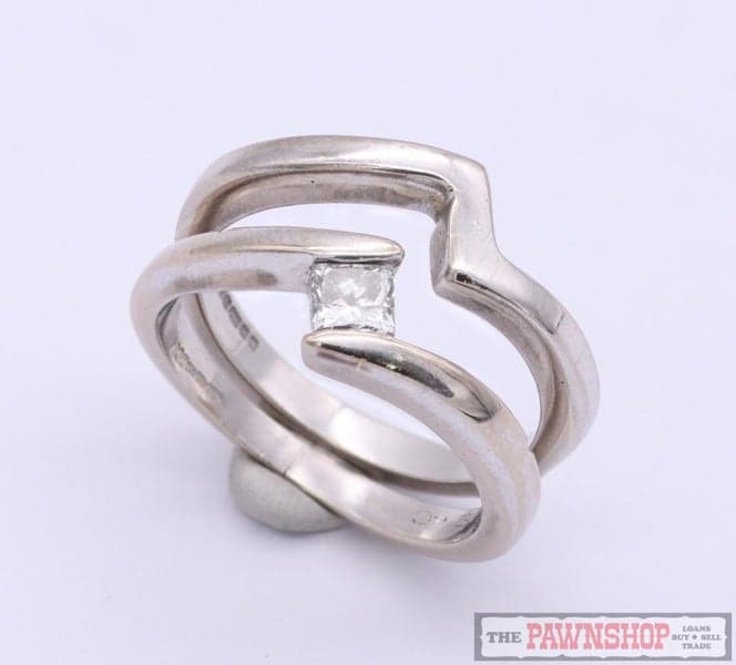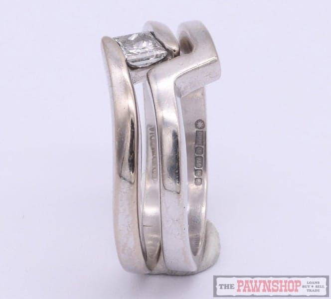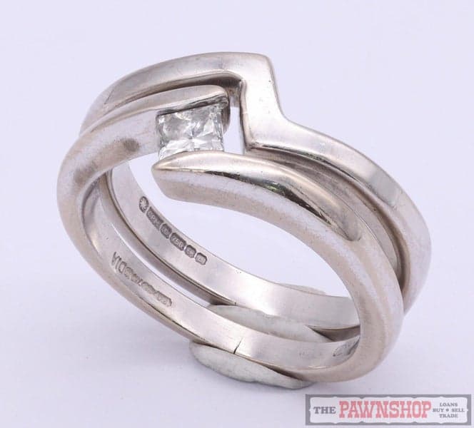 On offer here we have this stunning and unique 18kt white gold diamond bridal ring set, featuring a princess cut diamond solitaire on a square edge 2.10mm reverse tapered semi-round "zig-zag" band; and a matching 2.52mm white gold reverse tapered semi-round square edge "zig zag" wedder.