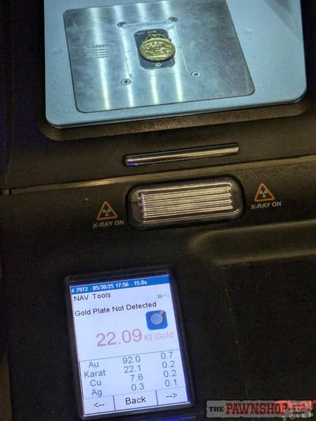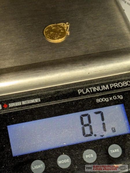 Unstamped. Tested 14ct gold bale and 22ct gold sovereign coin.