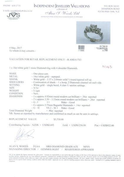On offer here this 3-Stone Diamond 14CT White Gold Ring with 4 Shoulder Diamonds.