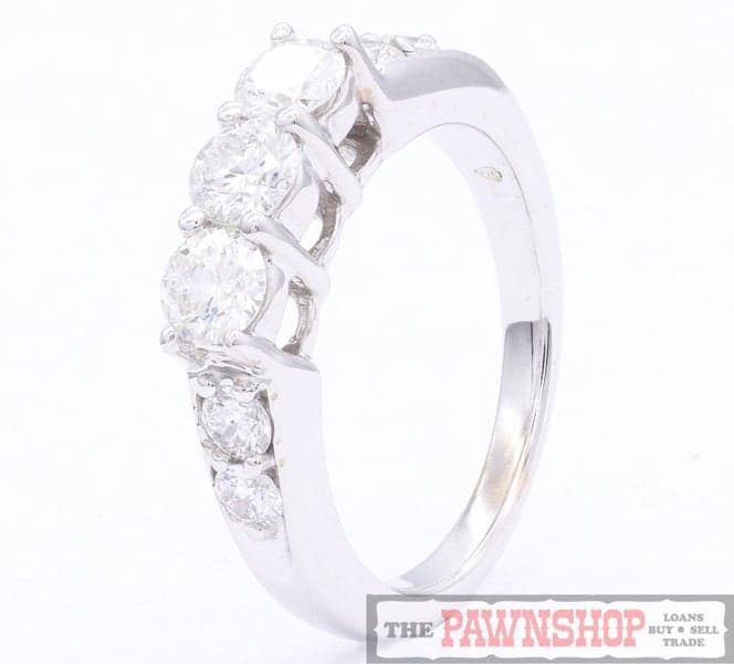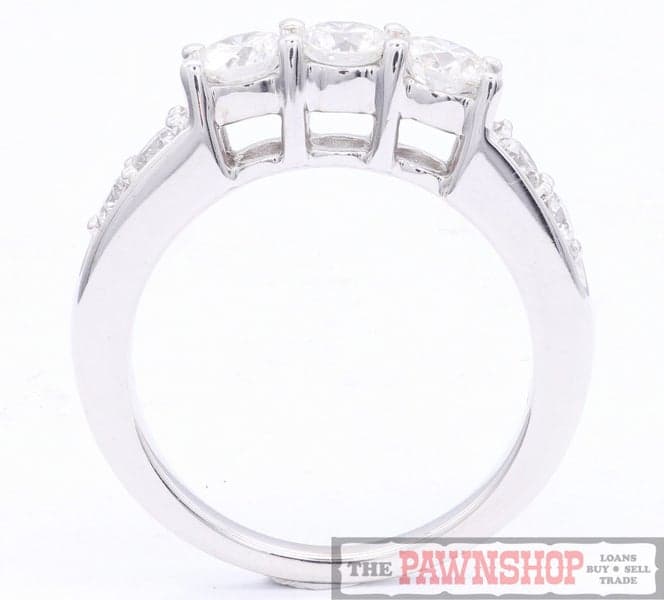 On offer here this 3-Stone Diamond 14CT White Gold Ring with 4 x Shoulder Diamonds.