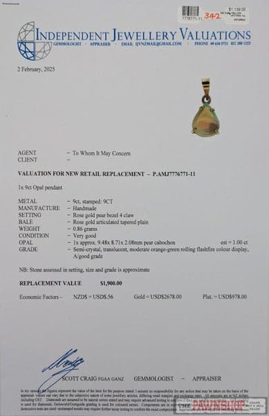 On offer here we have this gorgeous 9ct rose gold pendant, featuring 1.00ct pear-shaped opal in a 4 claw setting, with a replacement value of $1,900!